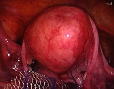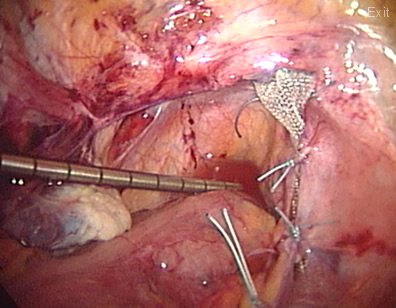 The mesh is attached to the sacrum (tail bone) and buried between the lining of the pelvis and the bones. The uterus is seen back to its normal position in the pelvis.