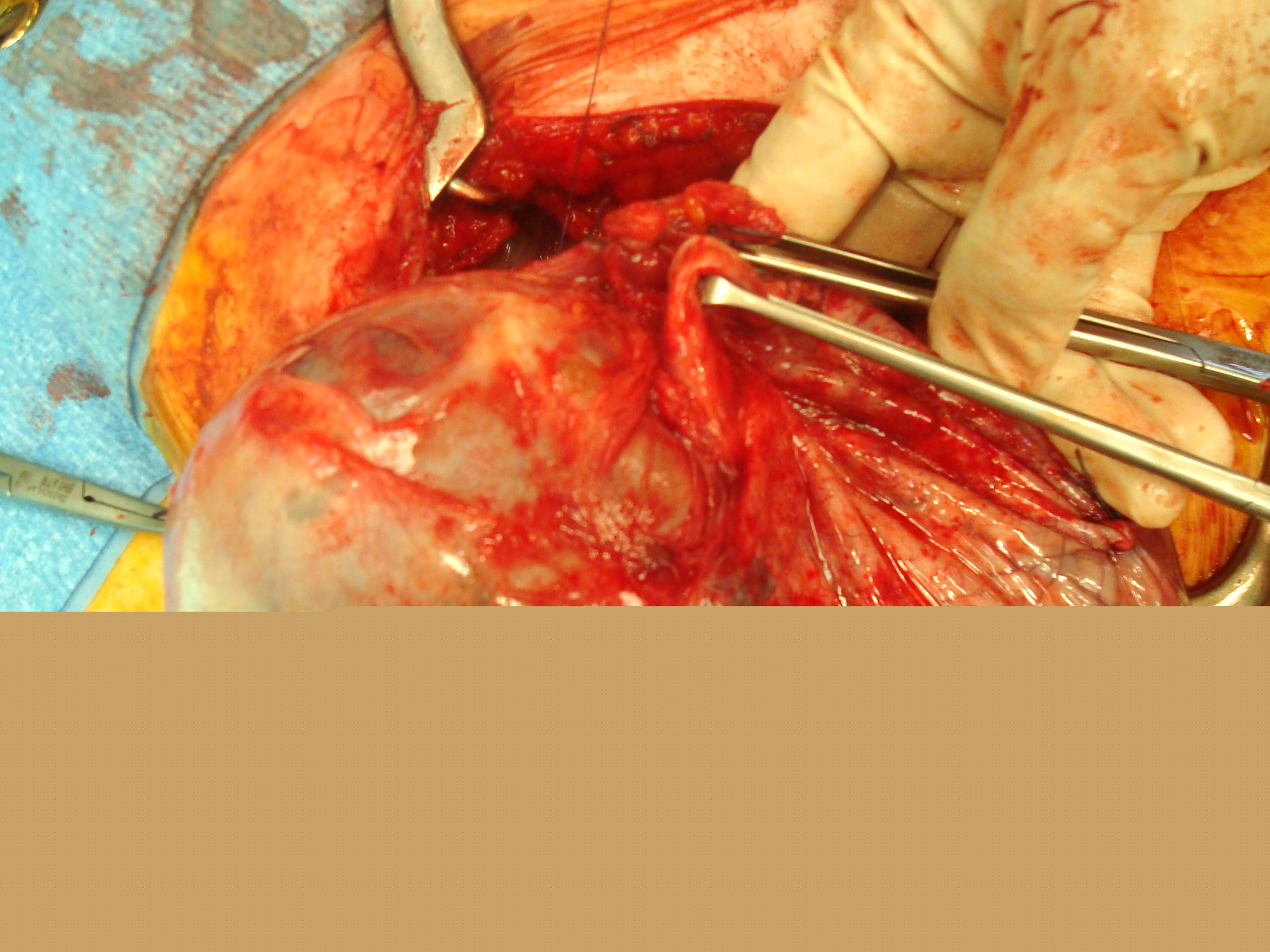 We are delivering a big cystic ovarian tumour taking care of avoiding spillage into the pelvic cavity.