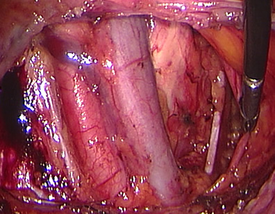 This patient had endometrial cancer (cancer from the lining of the uterus). She underwent total laparoscopic hysterectomy and laparoscopical removal of the ovaries. Laparoscopical lymphadenectomy was also performed at the same time. The photo shows lymph nodes removed from the External Iliac artery and vein. Deeper structures like the Obturator nerve and the Hypogastric artery are also visible. The final outcome was very positive and this patient needed no further treatment.