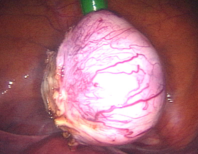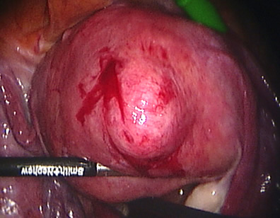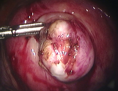 The uterus is opened and the fibroid has become visible.