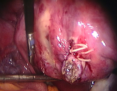The uterus is being reconstructed with sutures applied laparoscopically.