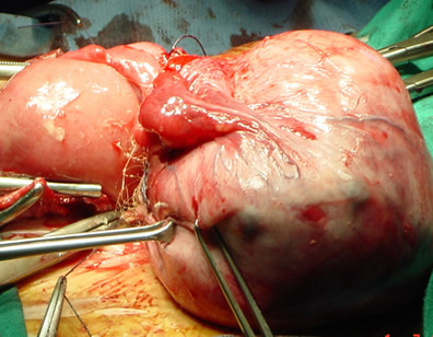 We are delivering a big cystic ovarian tumour taking care of avoiding spillage into the pelvic cavity.