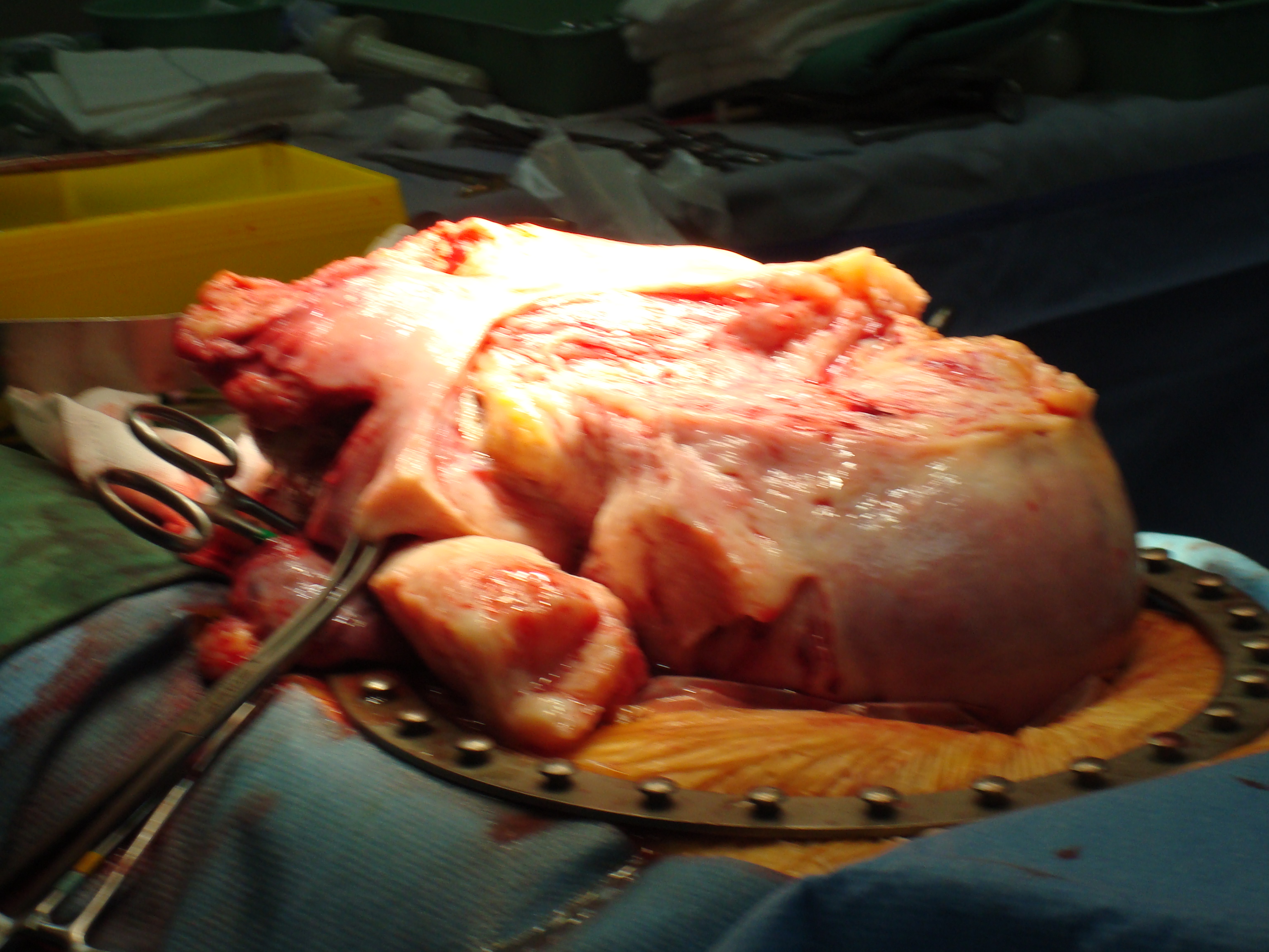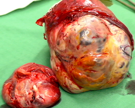 This lady had a semisolid ovarian tumour and a fibroid uterus of considerable size. This was early cancer of the ovary and the prognosis was excellent.